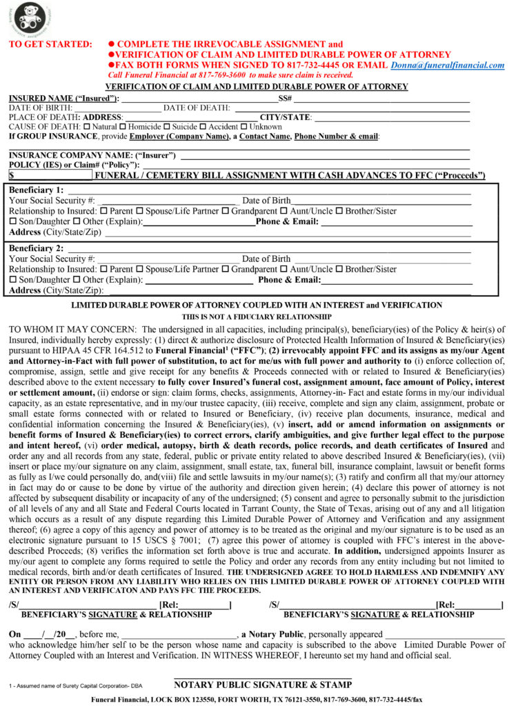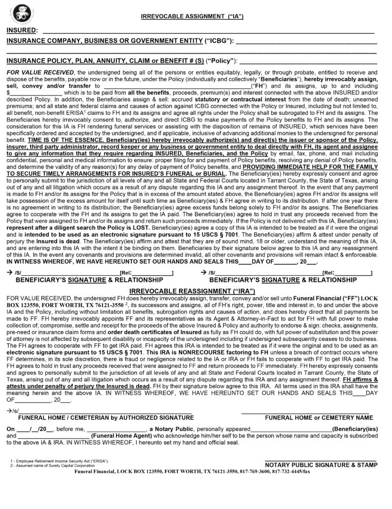 The top portion should be completed by the beneficiary(s) assigning the benefits to you, the funeral home. The bottom portion is completed by your authorized representative. Please NOTE: all signatures need to be notarized.